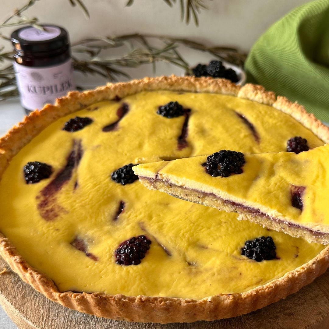 Proljeće je idealno vrijeme za lagane, osvježavajuće deserte, a jednostavna prhka pita u obliku tarta odličan je izbor. Jednom kad ga probate, ovaj ćete desert poželjeti često pripremati. Ključnu aromatičnu komponentu daje mu Kupilek extra džem od kupina bez umjetnih boja, aroma i sladila, a s visokim udjelom voća – sadržava čak 65 % kupina, čiji se bogat okus idealno sljubljuje uz laganu cheesecake kremu. No, osim bogata okusa, važno je naglasiti da kupine imaju i niz zdravstvenih prednosti: bogate su vitaminima C i K te antioksidansima koji jačaju imunološki sustav i pomažu u borbi protiv slobodnih radikala, a poznate su i po svom povoljnom učinku na probavu i zdravlje srca.